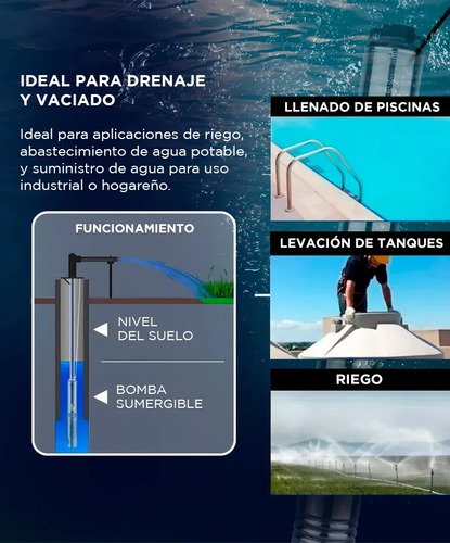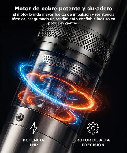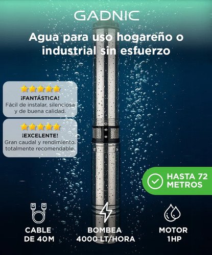 Bomba Sumergible de Pozo hasta 72 mts de Gadnic ideal para extraer agua de pozos profundos o napas subterráneas. Con un motor potente que impulsa los impulsores de manera eficiente y confiable, es adecuada para uso doméstico, agrícola o industrial, proporcionando un suministro constante de agua limpia y fresca. Diseñada para soportar uso continuo y proporcionar un rendimiento óptimo durante años, con construcción de alta calidad y durabilidad.