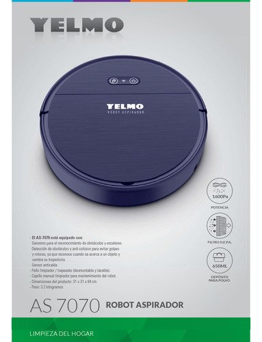 El robot aspirador Yelmo AS 7070 está diseñado para el mantenimiento diario del hogar, evitando la acumulación de polvo suciedad y pelo de mascotas. Incorpora un potente motor digital BLDC que alcanza 1600 Pa de potencia de succión y un perfil superfino de solo 84 mm que permite limpiar debajo de sofás y camas. Cuenta con batería de litio de 2600 mAh y detección inteligente de baja batería con recarga automática en la base. Puede manejarse mediante control remoto y ofrece modos de limpieza automático y punto fijo. Incluye paño limpiador trapeador desmontable que amplía sus funciones de limpieza.