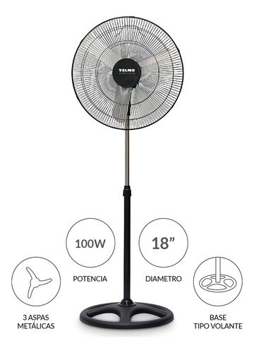 El Ventilador de Pie Yelmo VT-3818 es la solución ideal para mantener tu espacio fresco y confortable. Con un diámetro de 50 cm y una altura de 1.65 m, este ventilador combina un diseño elegante en color negro con un rendimiento eficiente. Sus tres aspas de metal garantizan un flujo de aire potente, mientras que su potencia de 90 W asegura un funcionamiento eficaz.