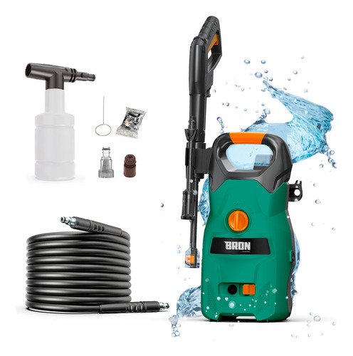 Diseñada para ser portátil, su color verde vibrante no solo la hace atractiva, sino que también facilita su transporte gracias a su mango ergonómico. Incluye una variedad de accesorios, como una botella para jabón, conectores de entrada y rápido, un pin de boquilla y una pistola rociadora, que optimizan su uso en diferentes superficies.