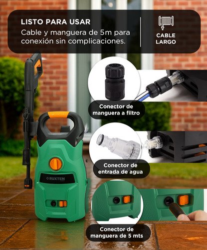 El depósito de espuma permite aplicar productos de limpieza de manera efectiva, mientras que el porta accesorios y la manguera aseguran que todo esté al alcance de la mano. Esta hidrolavadora es perfecta para quienes buscan una solución práctica y eficiente para la limpieza de patios, vehículos y otras áreas del hogar.