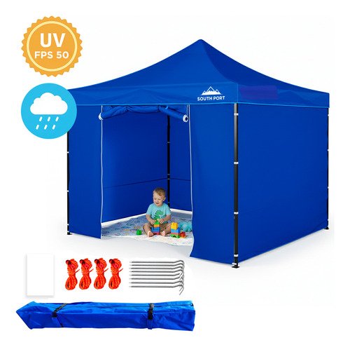 Su techo está confeccionado en poliéster 600D con recubrimiento de PVC, mientras que las paredes laterales son de poliéster 420D, lo que garantiza resistencia al agua y buen desempeño al aire libre. La estructura metálica de acero recubierto aporta firmeza, y el sistema de plegado tipo tijera permite un armado rápido sin complicaciones.