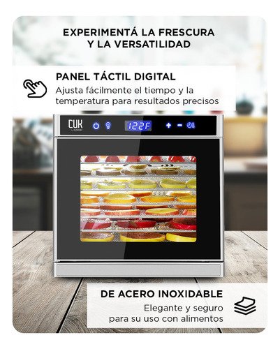 Con un panel táctil digital ajustás el tiempo y la temperatura según el tipo de alimento que estás deshidratando. El rango de 35 °C a 75 °C y el temporizador hasta 24 horas permiten adaptar el proceso a cada preparación. Su ventilador interno garantiza secado uniforme en todas las bandejas mientras la puerta transparente y luz interior te permiten supervisar sin interrupciones.