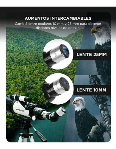 El Telescopio Reflector Gadnic 400×70 (modelo TE10) está diseñado para explorar estrellas, luna y paisajes diurnos con una óptica de alto rendimiento y facilidad de uso. Su apertura de 70mm y distancia focal de 400mm (f/5.7) aseguran vistas luminosas y claras, mientras su lente óptica con múltiples capas optimiza la transmisión de luz.