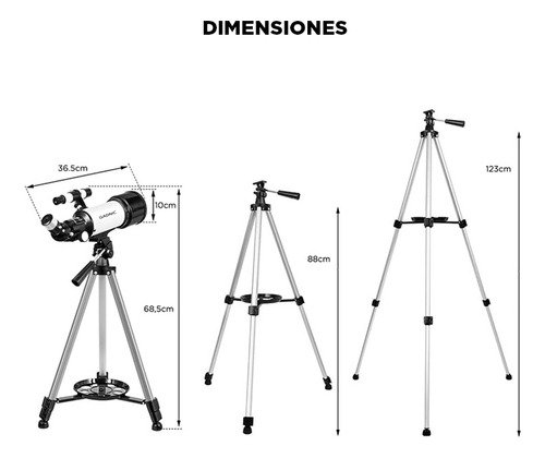 Viene con trípode retráctil de aluminio ajustable (desde 68,5cm a 123cm) y estuche de transporte, lo que lo hace ideal para llevar a cualquier lugar. Su montaje es rápido y sencillo, perfecto para principiantes o como regalo educativo.